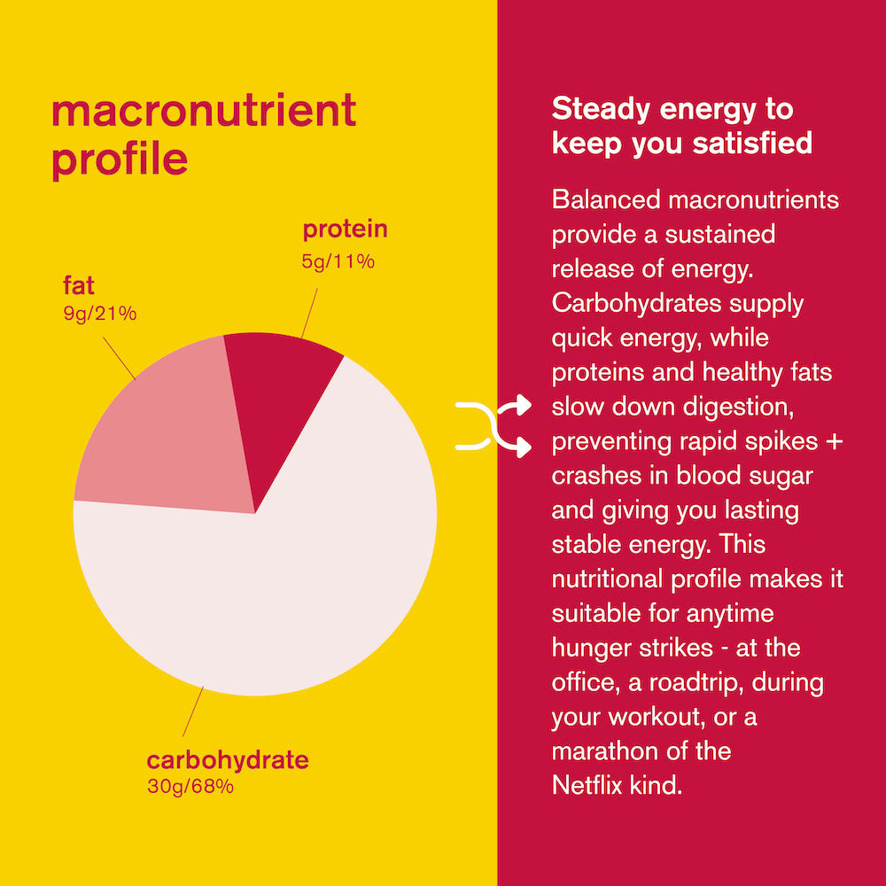 We kept our energy bar as simple as possible, using the fewest number of whole food ingredients without sacrificing taste. Made with half as much sugar as the leading energy bar*, our energy bars have a mixed macronutrient profile of protein, fats, and carbs for steady digestion and absorption with 4-5g of protein from nuts & nut butters.